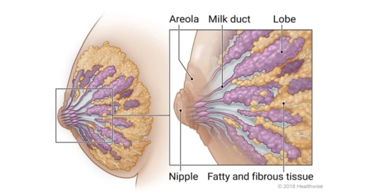 To understand what can happen in the breast, it helps to take a quick look at its anatomy. Milk is produced in the lobules, and it drains to the nipple through ducts. Surrounding the lobules and ducts are fat and connective tissues.